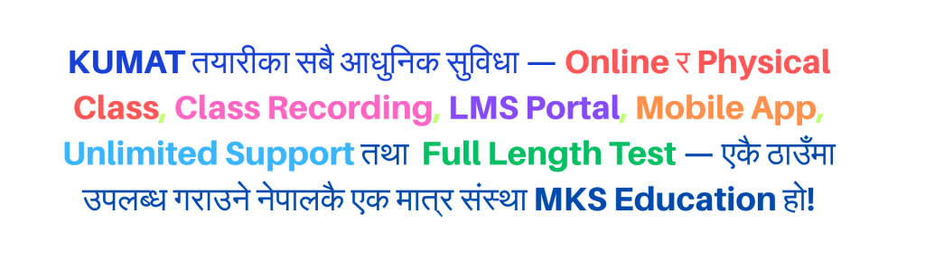 Looking to excel in the KUMAT examination in Kathmandu, Nepal? Look no further than MKS Education, renowned for conducting the best classes in the city. Led by a team of expert instructors, including Manoj K. Singh, Mod N. Jha, and Sanjita Pandey, we offer top-notch coaching to help you ace the exam’s Verbal Reasoning, Quantitative Reasoning, and Writing sections. What sets us apart is our exclusive Learning Management System (LMS) support, available only to our students in Nepal. Through our LMS portal, students access a range of resources, including time-bound tests for reading comprehension, critical reasoning, and sentence correction—all essential topics in quantitative reasoning. With MKS Education, you’ll receive the guidance and support you need to succeed in the KUMAT examination and secure your spot in Kathmandu University’s MBA program.